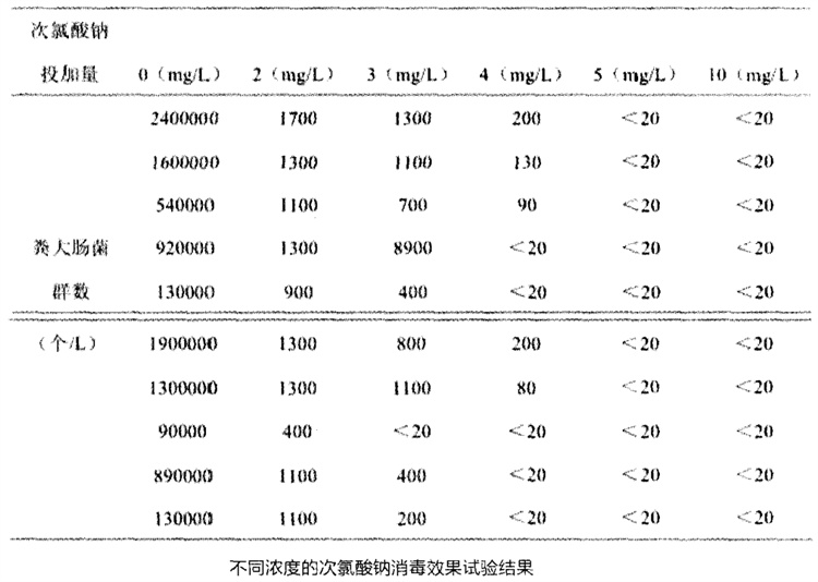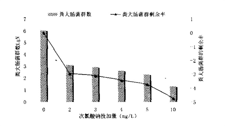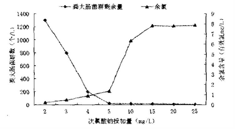 消毒处理时投氯量的控制视原水水质和消毒要求不同而异。以某个污水厂的原水为例,如果加不同浓度的次氯酸钠溶液,接触时间30min后,测粪大肠菌含量,可以看到不同浓度的次氯酸钠经过30min作用后对二级出水粪大肠菌群的灭活效果如图。